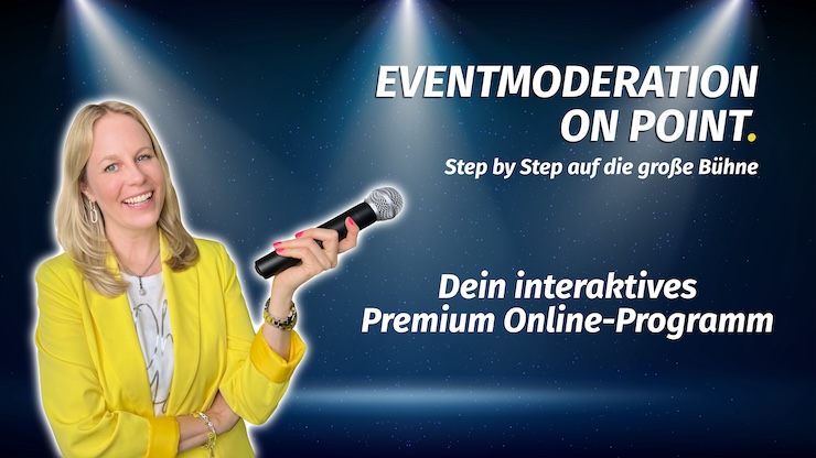 Seit 2020 bis 2025 habe ich mein Premium Online Programm erfolgreich durchgeführt. „EVENTMODERATION ON POINT. Step by Step auf die große Bühne.“